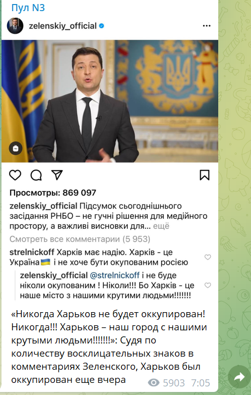 "Судя по количеству восклицательных знаков в комментариях Зеленского, Харьков был оккупирован ещё вчера", - тонко пошутил автор телеграм-канала кремлёвских журналистов "Пул № 3".