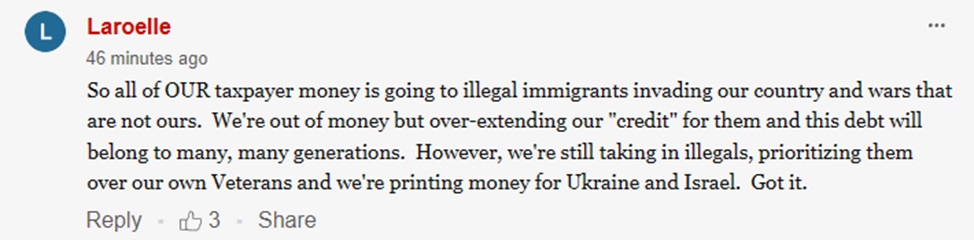"Все деньги НАШИХ налогоплательщиков идут на нелегальных иммигрантов, вторгающихся в нашу страну, и войны, которые нам не принадлежат. У нас нет денег, но мы чрезмерно расширяем кредиты для них, и этот долг будет принадлежать многим, многим поколениям. Однако мы по-прежнему принимаем нелегалов, отдавая им предпочтение перед американцами", - возмутился Laroelle.