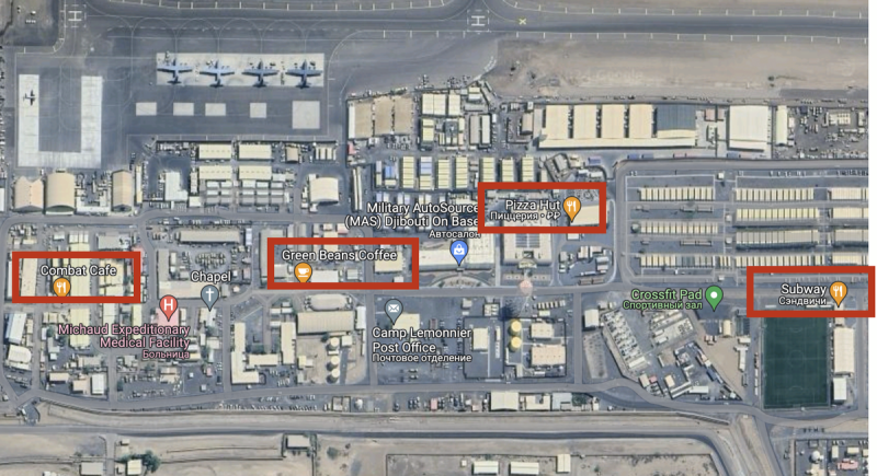 А вот американская база удивила наличием "Сабвея" (что-то вроде "Макдоналдса"), "Пиццы Хат" (мировая сеть пиццерий) и прочих кафешек. Также на базе есть: