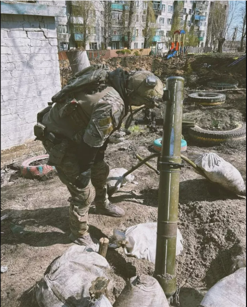 На странице ЧВК в соцсетях появились фото, где мужчина в военной форме со знаками, напоминающими американские флаги, наклонился над миномётом. Оборудование для ведения огня установлено неподалеку от детской площадки и жилого здания.