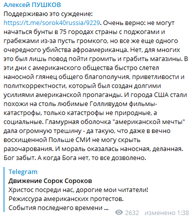 Массовые беспорядки в США показали, что весь этот имидж стабильности и благополучия - не более чем маска, создаваемая американской пропагандой. Член Совета Федерации России Алексей Пушков объяснил, почему США превратились в фильм-катастрофу.