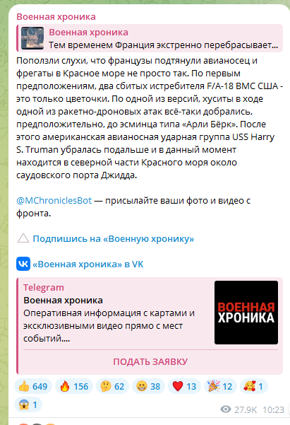 Тем временем авторы телеграм-канала "Военная хроника" пишут – есть сведения о том, что в Красном море неспроста появились фрегаты и авианосец из Франции.