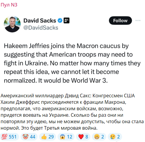 Сакс прокомментировал слова конгрессмена Хакима Джеффриса, который заявил о возможной отправке американских войск на Украину. Миллиардер отметил, что это прямой путь к столкновению с Россией, а значит - к третьей мировой войне.