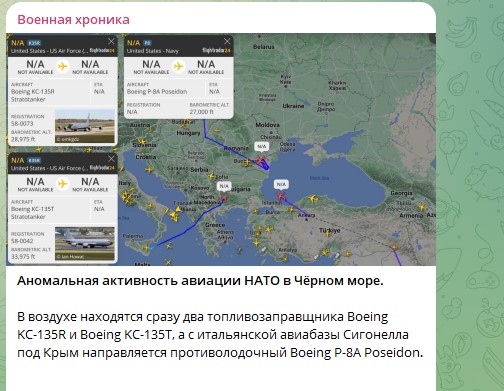 По данным авторов телеграм-канала "Военная хроника", сейчас в воздухе находятся сразу два топливозаправщика - Boeing KC-135R и Boeing KC-135T, - а с итальянской авиабазы Сигонелла под Крым направляется противолодочный Boeing P-8A Poseidon.