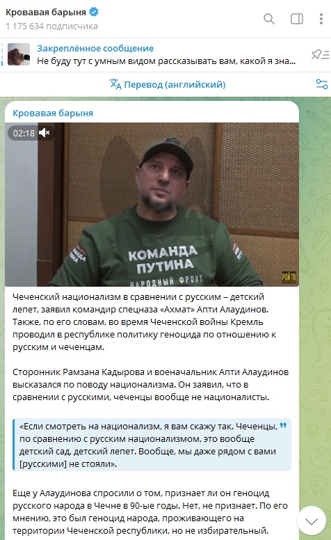 "Существует группа журналистов, работающих с явной чеченофобской направленностью, которые стремятся создать негативный образ чеченцев и выставить их виновными во всех бедах России. Если внимательно слушать их высказывания, создается впечатление, что все проблемы на этой земле связаны с чеченцами, часто звучат имена "Ахмат" и Апти Алаудинов. Я намерен отвечать на их нападки, так как они этого заслуживают, и для меня они не представляют никакой связи с русскими или Россией. Это та категория людей, которая работает на наших врагов внутри страны".