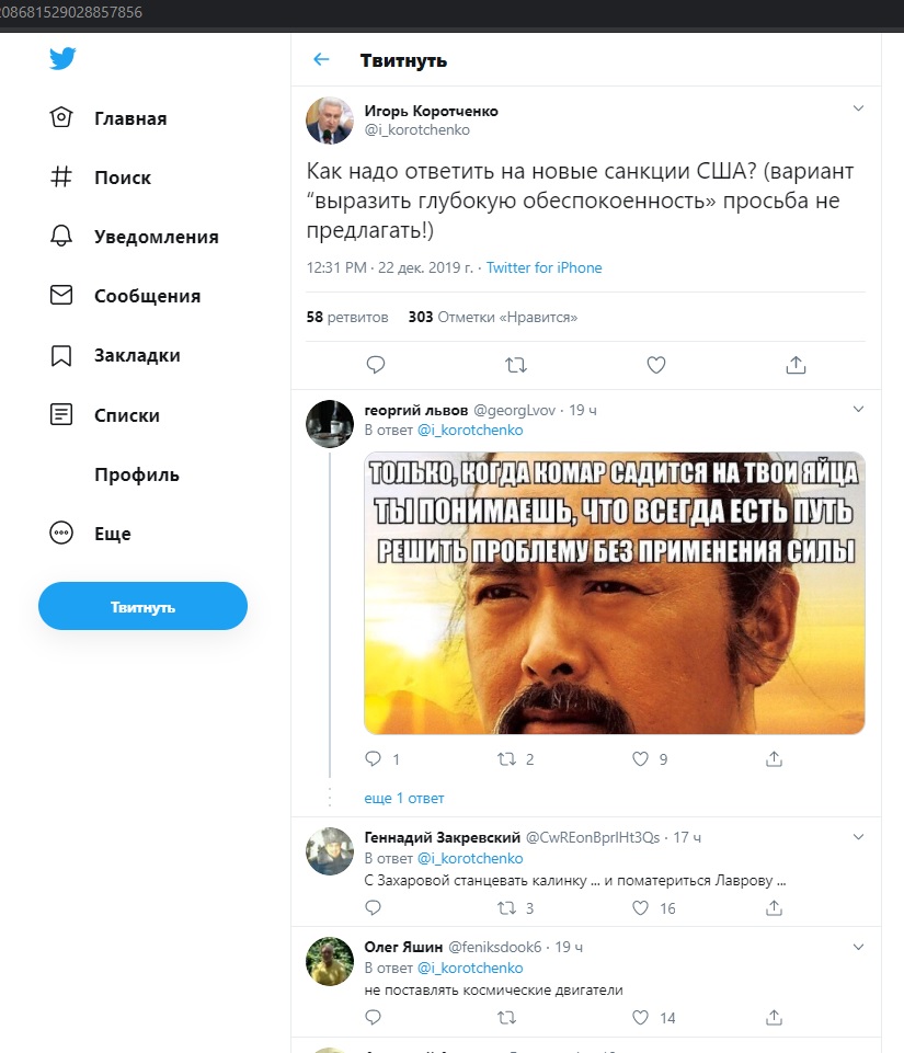 Игорь Коротченко запустил опрос на личной странице Twitter, собирая мнения о возможных вариантах ответа России на санкции США. Итак, как Россия может "ударить" по Вашингтону? Ответы дали самые разные - от "ареста депутатов" до высылки "пособников Госдепа" - "визг поднимется до ультразвука".
