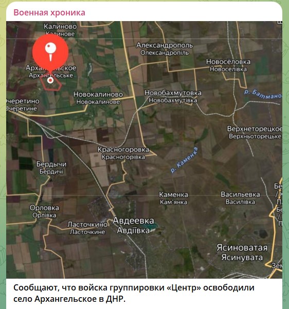 "Подразделения группировки войск "Центр" в результате успешных боевых действий освободили населенный пункт Архангельское Донецкой Народной Республики", - сообщает русское военное ведомство.