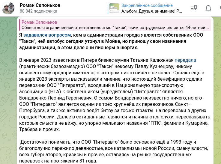 Согласно официальным данным районных судов, с 1 января 2022 года по 10 мая 2024 года ООО "Такси", которому принадлежал затонувший автобус, 23 раза привлекалось к административной ответственности за осуществление транспортной деятельности без лицензии и с грубыми нарушениями условий, предусмотренных лицензией. На компанию были наложены штрафы на общую сумму 3,6 миллиона рублей, сообщала объединённая пресс-служба судов города.