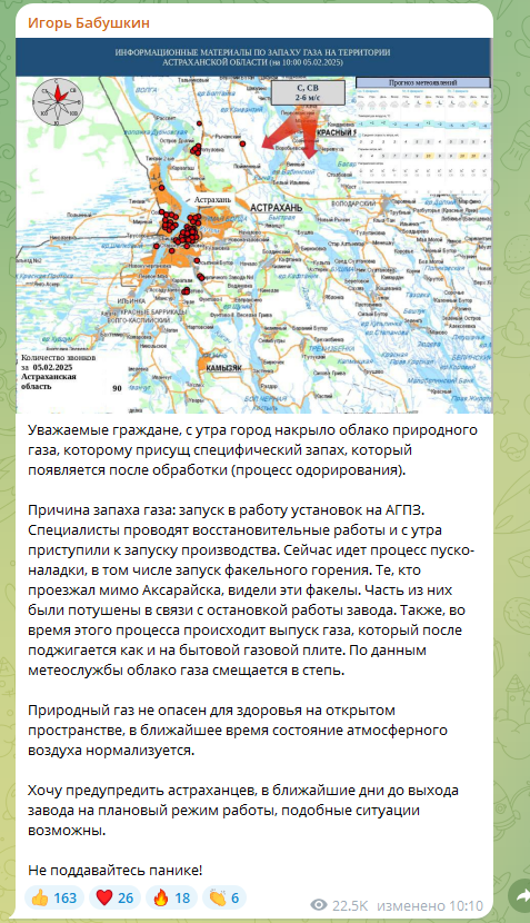Губернатор Астраханской области Игорь Бабушкин в своём телеграм-канале оперативно подтвердил, что город "накрыло облако газа". Запах – оттого, что это уже одорированный (смешанный со специальным пахучим веществом, сам по себе природный газ запаха не имеет, а придают его для обнаружения утечек) продукт. Губернатор рассказал, что специфически пахнет по причине запуска в работу установок на Астраханском ГПЗ.