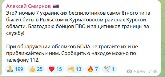 Этой ночью семь украинских беспилотников самолётного типа были сбиты в Рыльском и Курчатовском районах Курской области. Благодарю бойцов ПВО и защитников границы за службу! При обнаружении обломков БПЛА не трогайте их и не приближайтесь к ним,