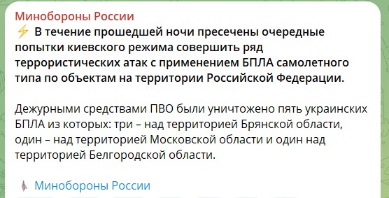 "Дежурными средствами ПВО были уничтожены пять украинских БПЛА из которых: три - над территорией Брянской области, один - над территорией Московской области и один - над территорией Белгородской области", - указывает в Сети военное ведомство.