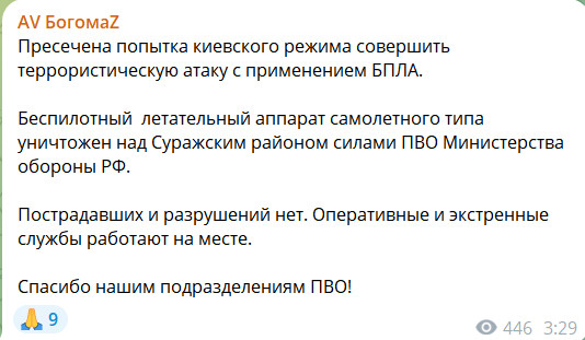 Атака ВСУ на Брянщину: Над Суражским районом уничтожен беспилотник