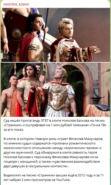 Телеканал "Точка ТВ" оштрафовали на миллион рублей за показ клипа Николая Баскова, в котором суд нашёл пропаганду ЛГБТ*. При этом в соцсетях вовсю обсуждают: в скандальном клипе одиннадцатилетней давности снялся артист Вячеслав Манучаров, который теперь оказался в щекотливом положении - именно его героя певец ревнует к женщине.