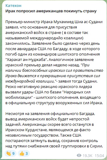 Премьер-министр Ирака Мухаммед Шиа ас-Судани объявил, что оснований для присутствия американского военного контингента больше не имеется. Напомним, военные США находятся в стране в составе международной коалиции. Теперь иракское правительство намерено инициировать процедуру вывода "гостей" из Америки.