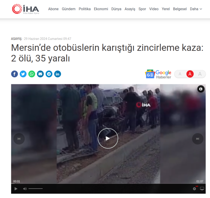 "Авария произошла на трассе D-400 Мерсин - Анталья, в границах района Ишиклы района Силифке. По полученной информации, И.К. перевозил работников АЭС "Аккую". Автобус с номерным знаком 06 EEP 718 под управлением (65) выехал на встречную полосу в результате того, что его водитель потерял контроль над рулевым колесом во время движения в направлении Мерсина", - говорится в публикации.