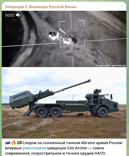 Следом за сожжённым танком Abrams армия России впервые уничтожила шведскую САУ Archer. Охота на западную технику в самом разгаре.
