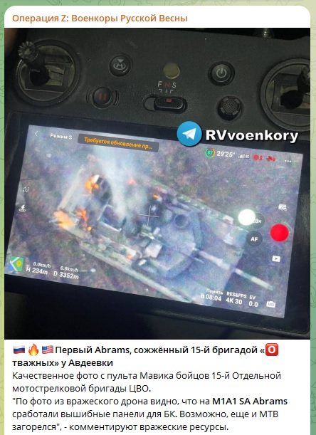 Он указал, что "Абрамс" был последним козырем ВСУ, который решили ввести в игру после падения Авдеевки. При этом даже украинские эксперты признавали, что "чудо-оружие" США будет сожжено, как и другая американская техника. Вопрос был лишь в том, кем именно будет побит этот "козырь" - ударом артиллерией, наездом на мину, попаданием противотанковой управляемой ракеты или подбит русским лётчиком.