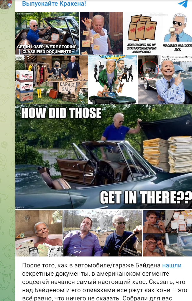 В американском сегменте интернета зубоскалят по поводу скандала с обнаруженными в гараже президента Джо Байдена конфиденциальными материалами. Пользователи уже отпускают шутки об НЛО и "секретных материалах Джо".