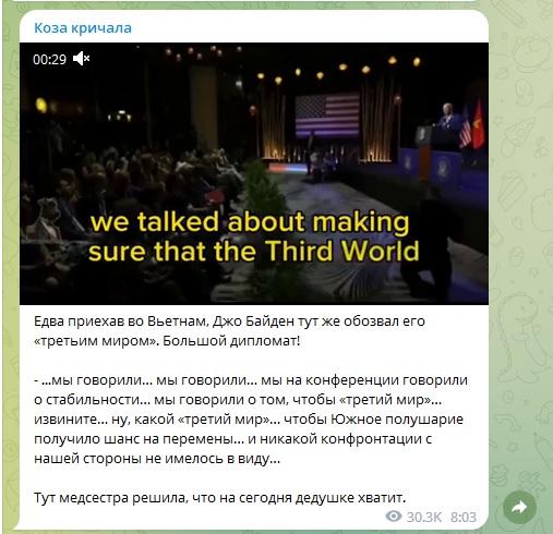 А в ходе пресс-конференции во вьетнамском Ханое президент США снова оговорился, да ещё как. Он назвал эту страну третьим миром. Затем поспешил исправиться, мол, имел в виду Южное полушарие, но его всё-таки решили по-тихому увести с трибуны.
