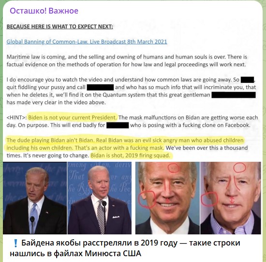 Если быть точнее, то в бумагах говорится следующее: "Байден - не наш нынешний президент. Сбой маски у Байдена становится хуже с каждым днём… Чувак, играющий Байдена - не Байден. Настоящий Байден был злым больным мужиком, который совращал детей, включая своих. Байден был застрелен в 2019 году".