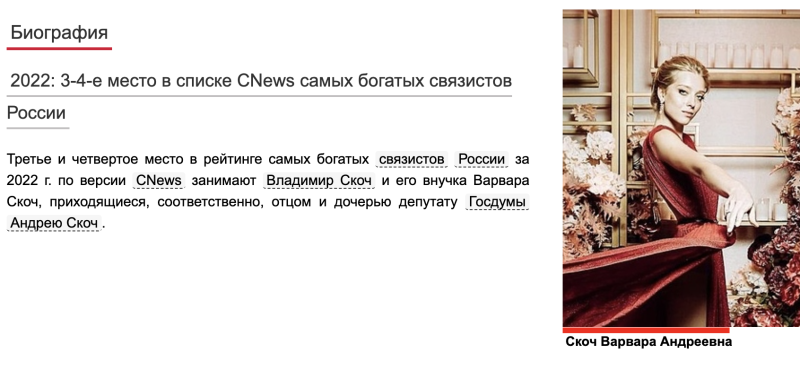 Замыкает тройку Варвара Скоч, состояние которой оценивается в "скромные" 2,2 млрд долларов. Она владеет долей в холдинге USM, который принадлежит её отцу Андрею Скочу - товарищу миллиардера Алишера Усманова.