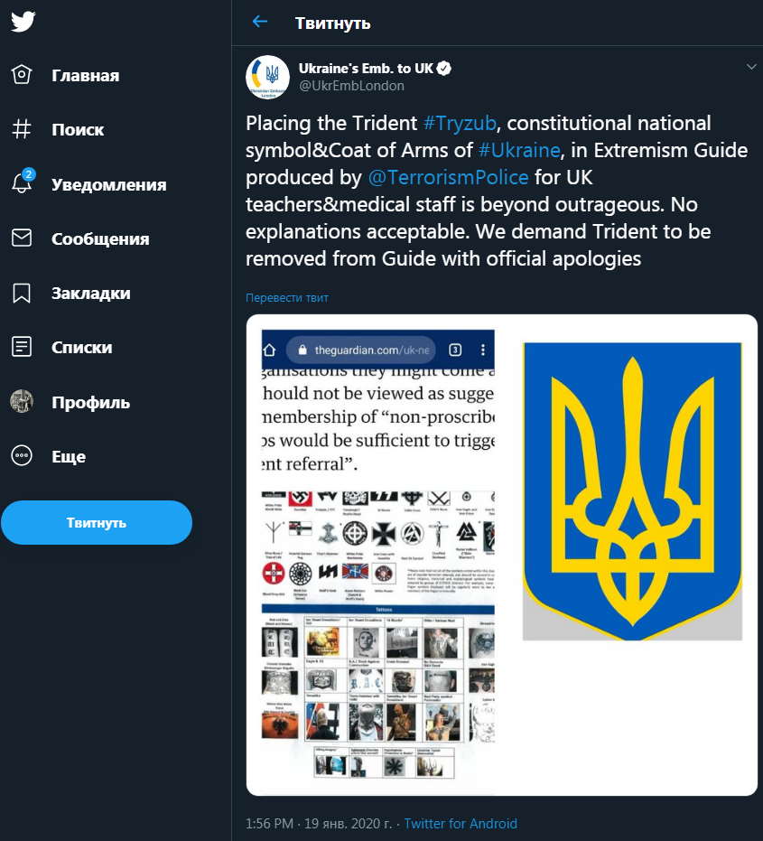Национальное антитеррористическое управление Великобритании (NCTPN) выпустило пособие по борьбе с экстремизмом, в которое включили и украинский трезубец. Посольство Украины в Лондоне потребовало исключить символ Незалежной из брошюры. "Бандеровцы уже визжат", - комментируют в Сети.