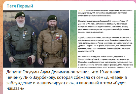 19-летняя Лия Заурбекова бежала из дома, из Чечни, в Москву. По крайней мере, так описали ситуацию её родственники. Правозащитникам и правоохранительным органам она жаловалась на насилие в семье, прячась от родственников в ОМВД Нагатино-Садовники. После того как соратник Кадырова сообщил, что девушку ввели в "заблуждение", и заявил о необходимости вернуть её домой, она покинула Россию, как заверил источник.