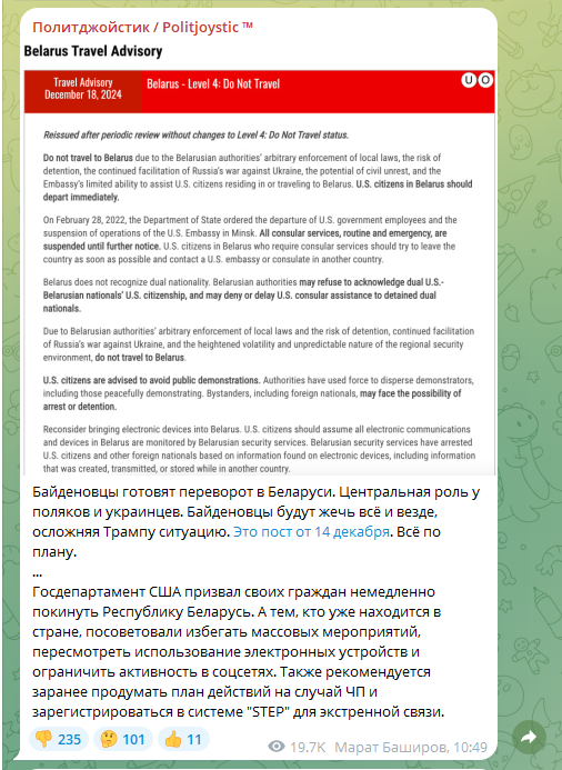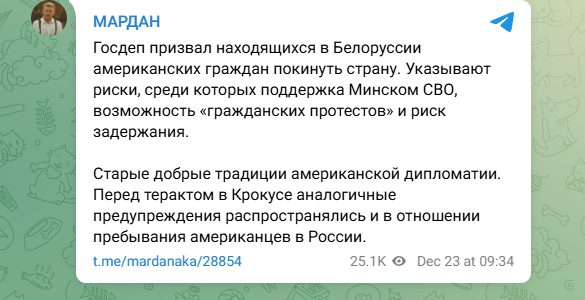 Журналист и радиоведущий Сергей Мардан обратил внимание на то, что в Госдепе также прямо указали на "возможные риски". Это "гражданские протесты", это поддержка Минском нашей СВО, а также пугают американцев задержаниями.