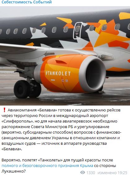Автор сообщения пошутил, что для пущего эффекта "Белавиа" может пустить в Крым свои знаменитые "танколёты" - самолёты, раскрашенные в стиле популярной белорусской ММО-игры World of Tanks.