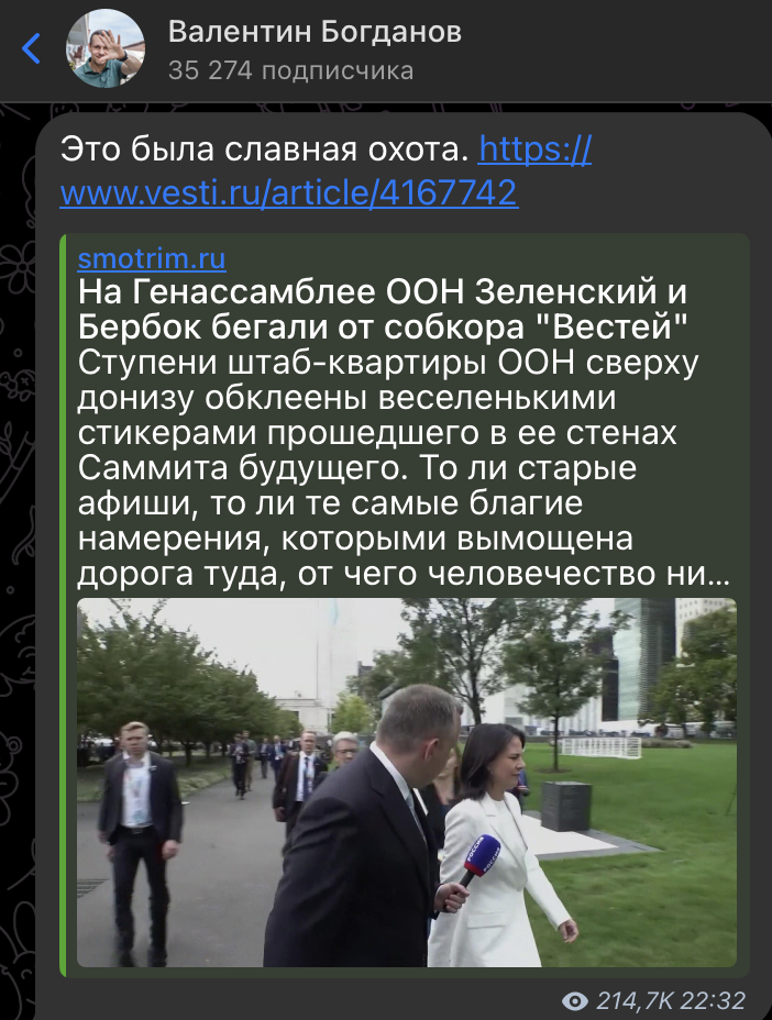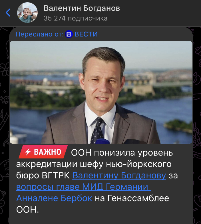 24 сентября на полях 79-й сессии Генеральной Ассамблеи ООН произошел инцидент, вызывающий серьёзные вопросы о соблюдении немецкими коллегами правил о свободе слова. Валентин Богданов, руководитель бюро ВГТРК в Нью-Йорке, попытался задать вопрос министру иностранных дел Германии Анналене Бербок на пресс-конференции, но столкнулся с препятствиями.