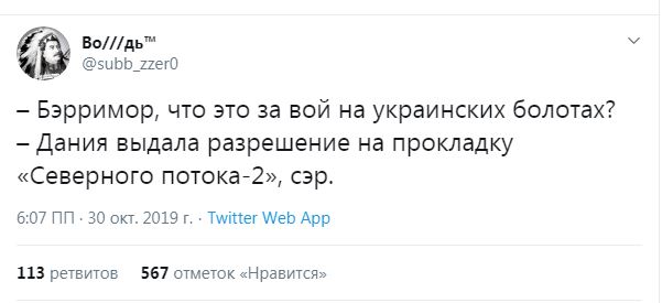 "Бэрримор, что это за вой на украинских болотах? - Дания выдала разрешение на прокладку "Северного потока - 2", сэр", - шутит автор Twitter-канала Во///дь.