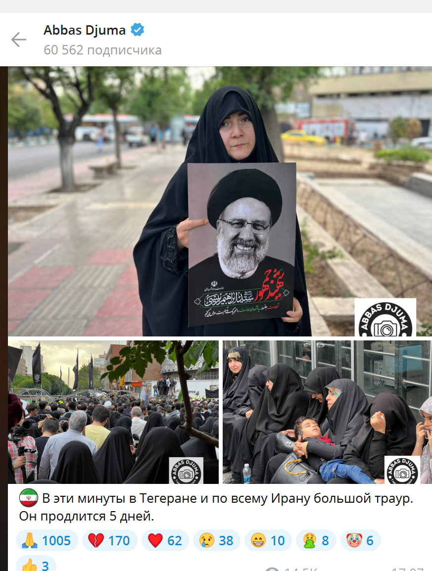 "Иранская оппозиция за рубежом строчит в соцсети фейки про то, что в Тегеране люди якобы празднуют крушение президентского вертолёта. Какие же бессовестные твари! В данный момент я нахожусь в центре Тегерана. Город замер. Люди молятся и ждут", - делился Джума в тот момент, когда не было известно, что произошло.