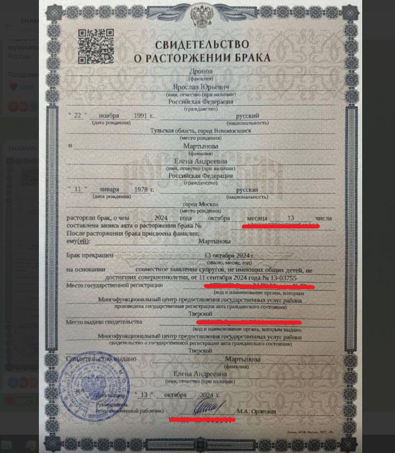 Вероятно, учитывая ажиотаж вокруг этой темы и желая сразу расставить все акценты, сегодня SHAMAN опубликовал в своём официальном телеграм-канале снимок свидетельства о расторжении брака. Согласно документу, Ярослав Дронов и Елена Мартынова не являются мужем и женой с 13 октября 2024 года. При этом на момент публикации никаких дополнительных комментариев певец в соцсетях не оставил.