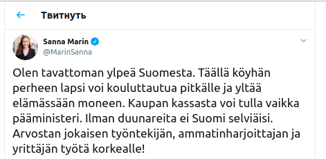 "Я очень горжусь Финляндией. Здесь ребёнок из бедной семьи может получить образование и многого достичь в своей жизни, - написала она у себя в Twitter. - Продавщица магазина может стать премьер-министром".
