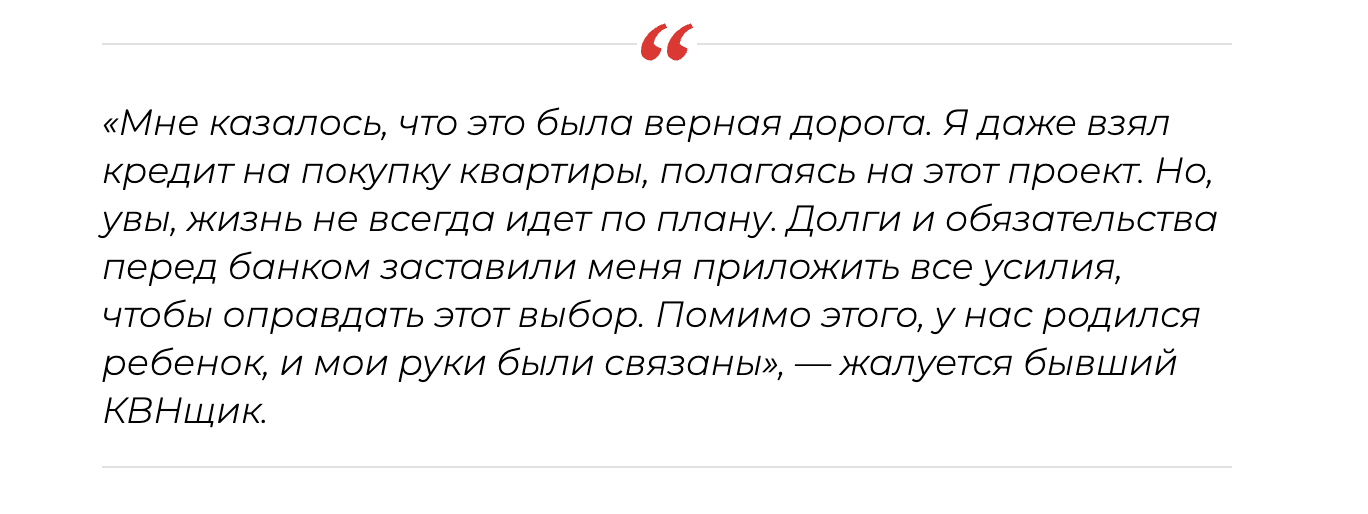 Ласточкин решил оправдать свою связь с Россией тем, что его держали деньги и долги перед банком. Комик был вынужден приложить все усилия, чтобы оправдать свой "предательский" выбор. Когда юморист озвучил свою позицию родственникам, те от него отвернулись, решив не трепать нервы жертвой украинской пропаганды.