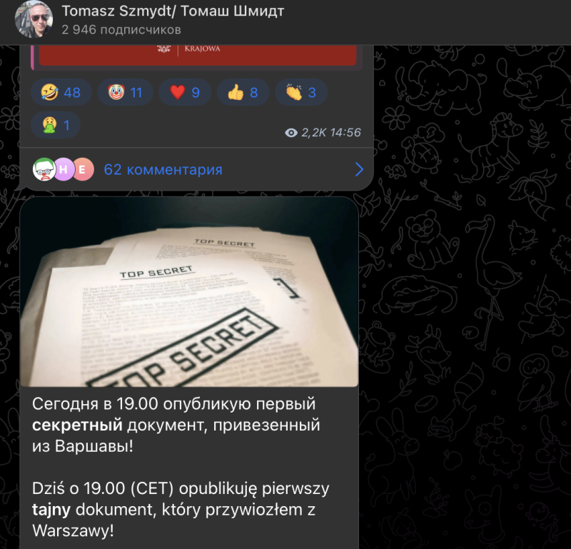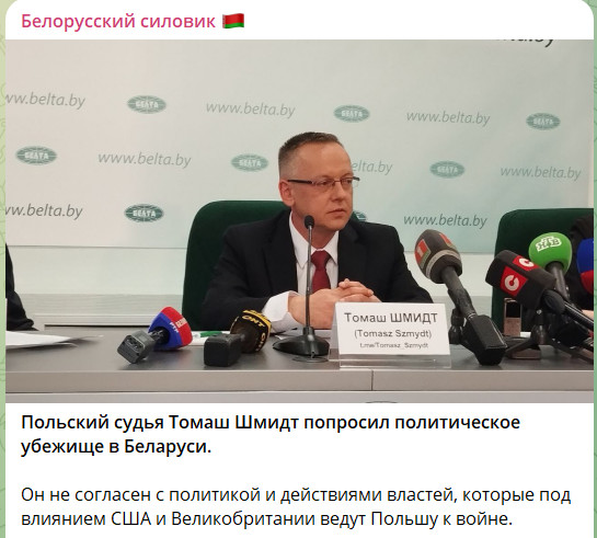 Польский судья Томаш Шмидт, бежавший в Белоруссию, чтобы запросить убежище, анонсировал скорую публикацию секретного документа, который он привёз из Варшавы. Эту информацию он раскрыл через свой канал в Telegram.
