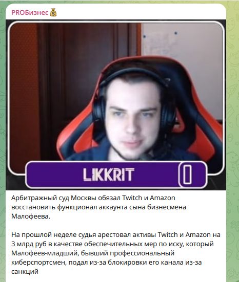 И вот теперь Арбитражный суд Москвы вынес беспрецедентное решение в отношении стримингового сервиса Twitch и Amazon за безосновательную блокировку аккаунта киберспортсмена Кирилла Малофеева.