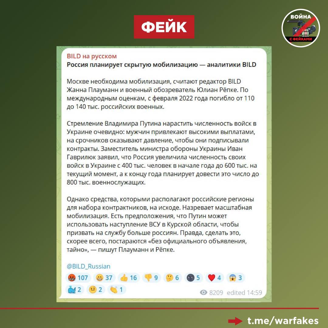 Власти России планируют провести "скрытую мобилизацию" под предлогом вторжения ВСУ в Курскую область, утверждает военный обозреватель издания Bild Юлиан Рёпке. Вброс был разоблачён в тот же день.
