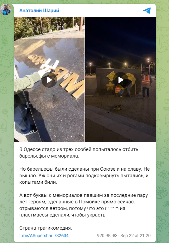 В Одессе трое мужчин, которых в Сети назвали просто "особи", проиграли в бесславной битве с советским мемориалом. Хотели отбить с постамента оставшийся там барельеф, но оказалось, что он прикреплён намертво и не поддался вандалам. "Уж они их и рогами подковырнуть пытались, и копытами били", - высмеял неудачу негодяев украинский блогер Анатолий Шарий. Особая ирония истории в том, что на одном из недавно сделанных мемориалов в честь украинских "героев" буквы с постамента отлетают просто от порывов ветра.
