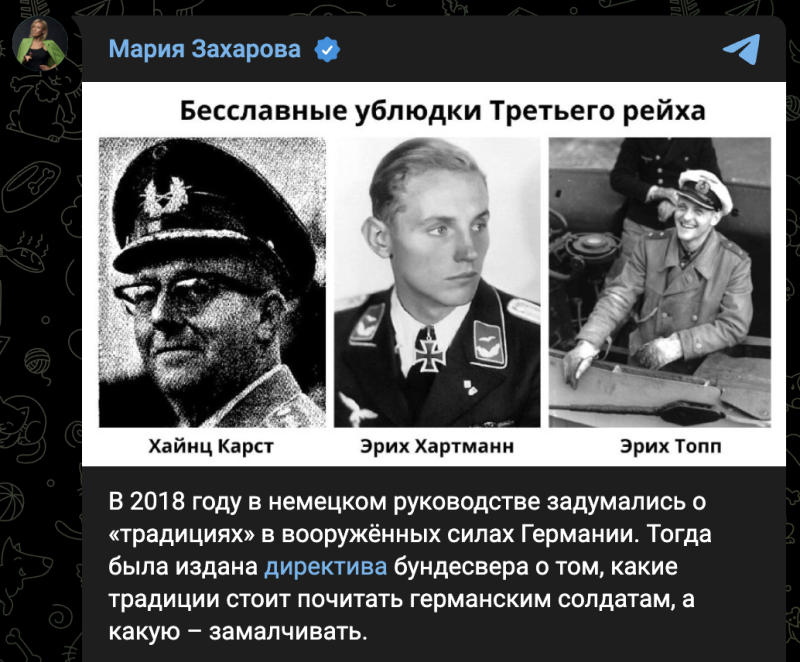 Пока солдаты армии России продолжают уничтожать немецкие танки на курской земле, в Германии вновь, как и восемьдесят лет назад, происходит восхваление "героизма" нацистов. Так официальный представитель МИД России прокомментировала новый перечень "военных героев", представленный Минобороны ФРГ.