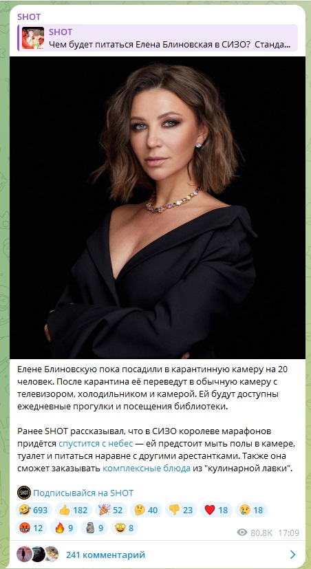Елена Блиновская сейчас проходит стандартные карантинные меры. После этого её переведут в камеру, где предусмотрены даже удобства, например телевизор и холодильник. А ещё она сможет заказывать еду из "кулинарной лавки".