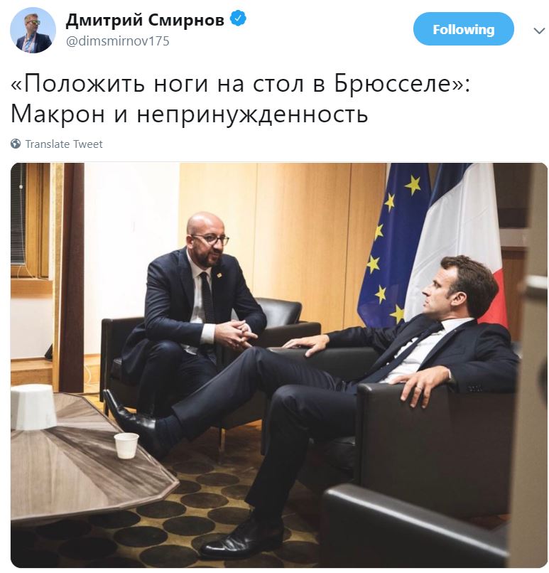 "Положить ноги на стол в Брюсселе", - скептично оценил непринуждённость Макрона журналист Дмитрий Смирнов, публикуя неоднозначный снимок.
