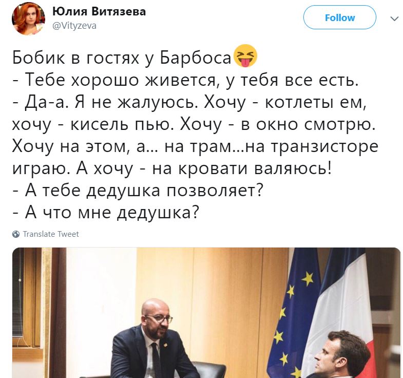 Президент Франции Эмманюэль Макрон удивил пользователей Сети своей невоспитанностью и европейскими манерами. Поводом для этого стало фото, сделанное на европейском саммите, - на нем политик сидит в вызывающей позе. "Бобик в гостях у Барбоса", - напомнила известную историю журналистка Юлия Витязева.