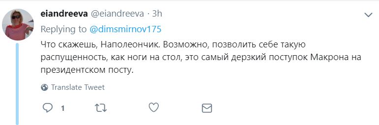 "Возможно, это самый дерзкий поступок Макрона на президентском посту", - иронизирует подписчица Смирнова в "Твиттере" eiandreeva, намекая на зависимость политики Франции от "вашингтонского обкома".