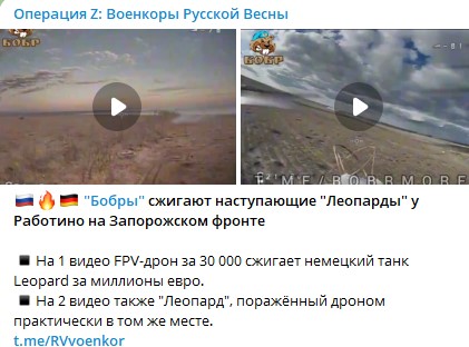 Беспилотный отряд быстрого реагирования (БОБРы) встречают наступающих "Леопардов" плотным огнём у Работино. На Запорожском фронте ярко горят немецкие танки.