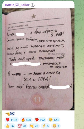 Очевидно, что боец не был намерен сдаваться в плен, а послание оставил специально для противника, чтобы тот его прочитал, когда сам солдат будет мёртв.