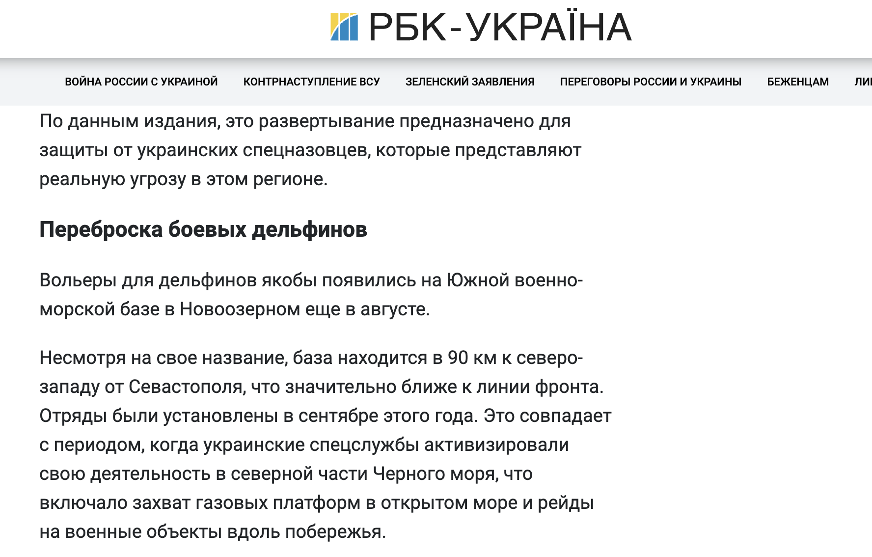 Украинцы, узнав, что Россия прибегнула к помощи столь необычных персонажей, решили, что у нас кончился флот, и даже выпустили разоблачающую статью. Но военные эксперты, причём не только русские, поспешили заверить, что дельфины действительно считаются весьма эффективными против водолазов, поскольку их непревзойдённая способность ориентирования в воде имеет массу преимуществ.