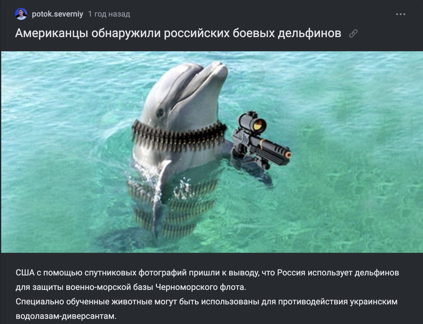 Пресс-служба британского Королевского флота Naval News поделилась с миром новостью о том, что на базах в Крыму орудуют дрессированные "дельфины-убийцы". Наши иностранные коллеги предположили, что на столь отчаянный шаг мы пошли из-за того, что в последнее время украинский спецназ стал особенно активен в акватории Чёрного моря.