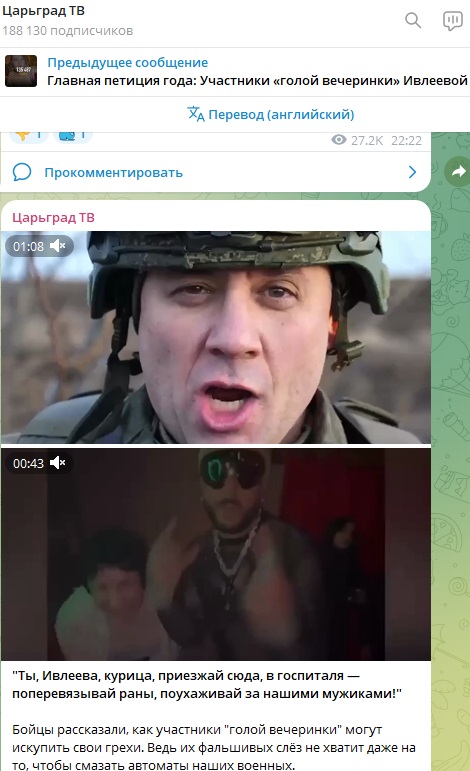 Продолжаете паразитировать, продолжаете позорить нас - военных, наших жён, наших детей, наших матерей... Мы здесь, в Донбассе, воюем за ваше мирное существование. А что вы делаете для нашей Победы? Что вы сделали для нашей матушки-России?! Сейчас вы упали на колени в слезах, молите о прощении, потому что боитесь потерять ваши гонорары. А ваши слёзы даже не помогут нам смазать наши автоматы. Вы, продажные ублюдки и предатели, пропагандируете ЛГБТ* и должны понести наказание по всей строгости закона. А чтобы искупить свои грехи, чтобы отмыть свой позор, вы должны участвовать в СВО, и приехать сюда, к нам на передовую, и давать концерты для наших бойцов. Ты, Ивлеева, приезжай сюда в госпитали, поперевязывай раны нашим бойцам, поубирай за нашими мужиками.