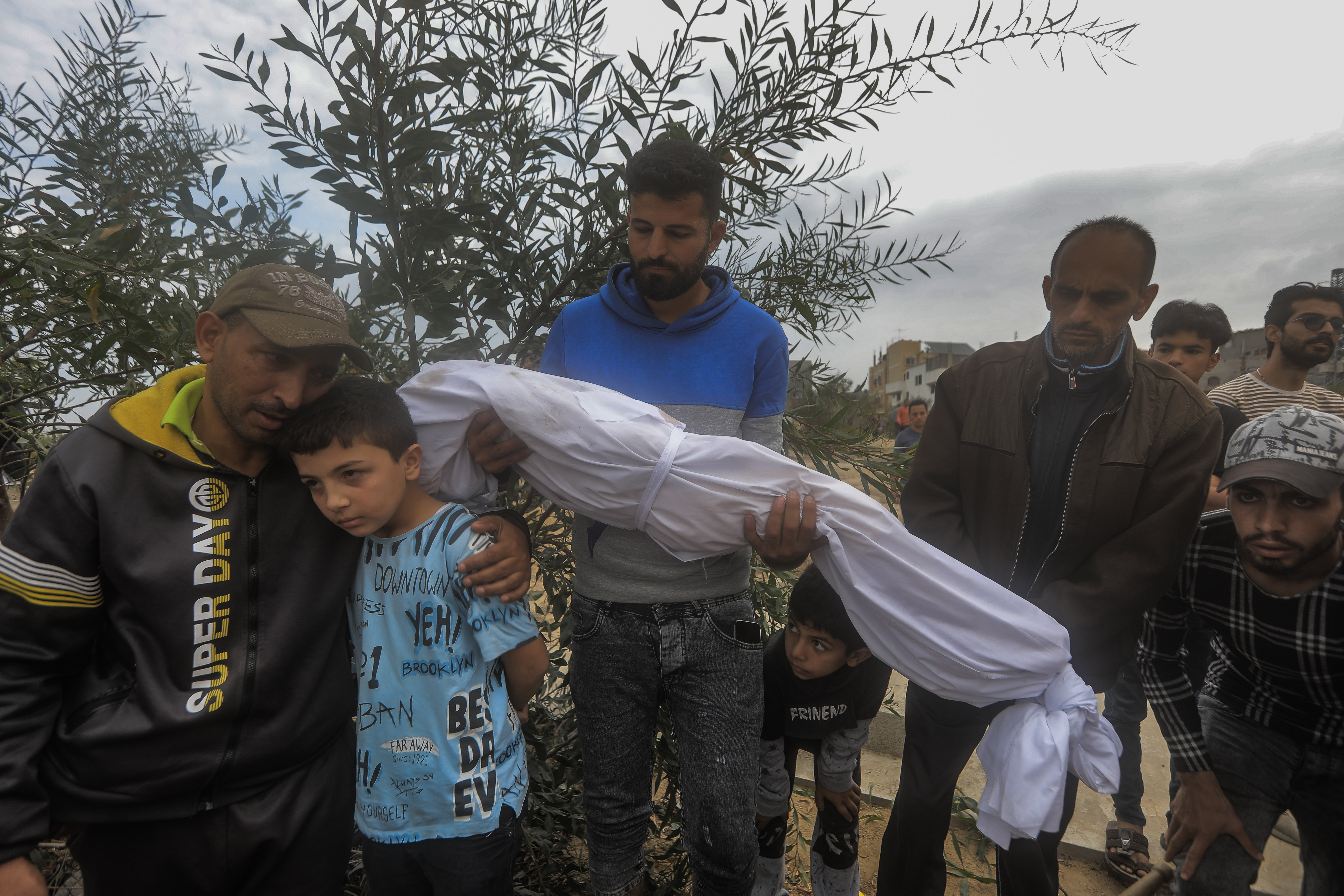 Скорбящие и медицинский персонал молятся над телами палестинцев, погибших во время ночных ударов по Рафаху на юге сектора Газа, в больнице Аль-Наджар. Фото: Mohammed Talatene/dpa
